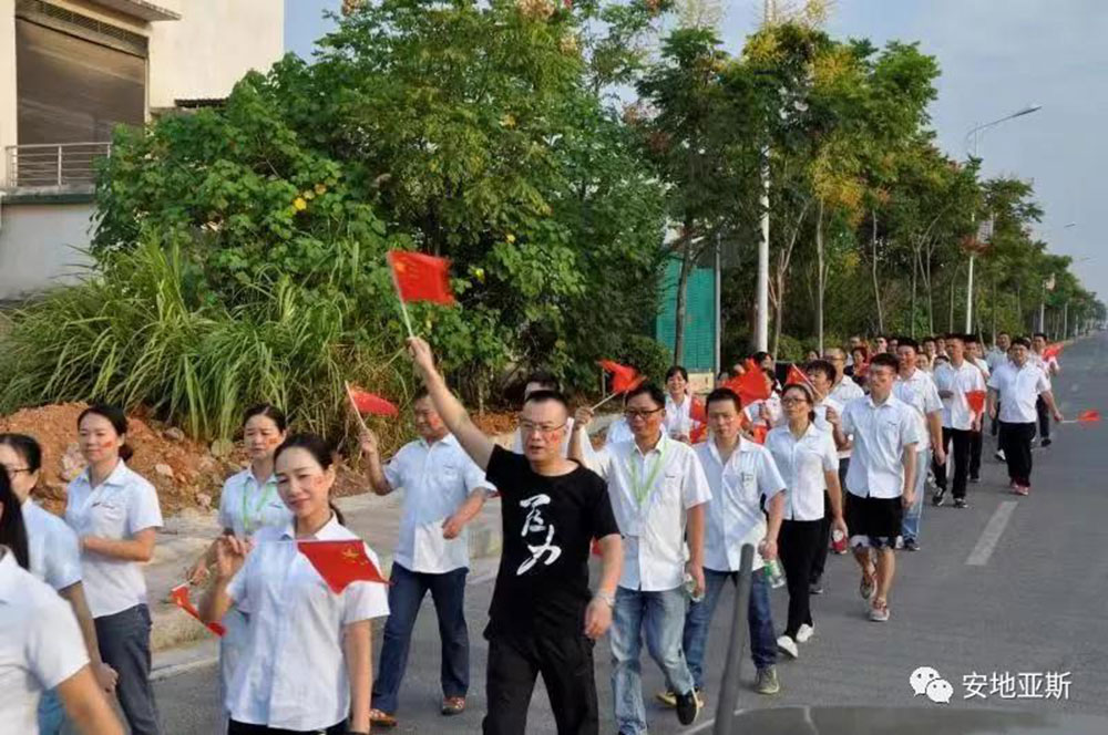 在這個(gè)舉國歡慶的日子里,安地亞斯董事長康丁華先生帶領(lǐng)我們安地亞斯的家屬,舉國旗,奏國歌,背紅旗徒步,弘揚(yáng)愛國主義精神,為慶祝中國誕辰70周年,祝祖國生日快樂。